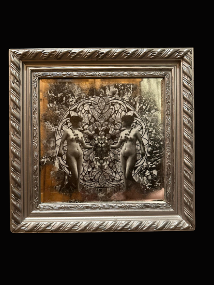 Grace Smith and Bradley Kokay have been working together for over ten years. Their art is made with analog techniques such as xerox manipulated images and gel medium transfer and the mirrors are sourced from thrift shops and antique stores. No computers are used. They are located in Eugene, Oregon.